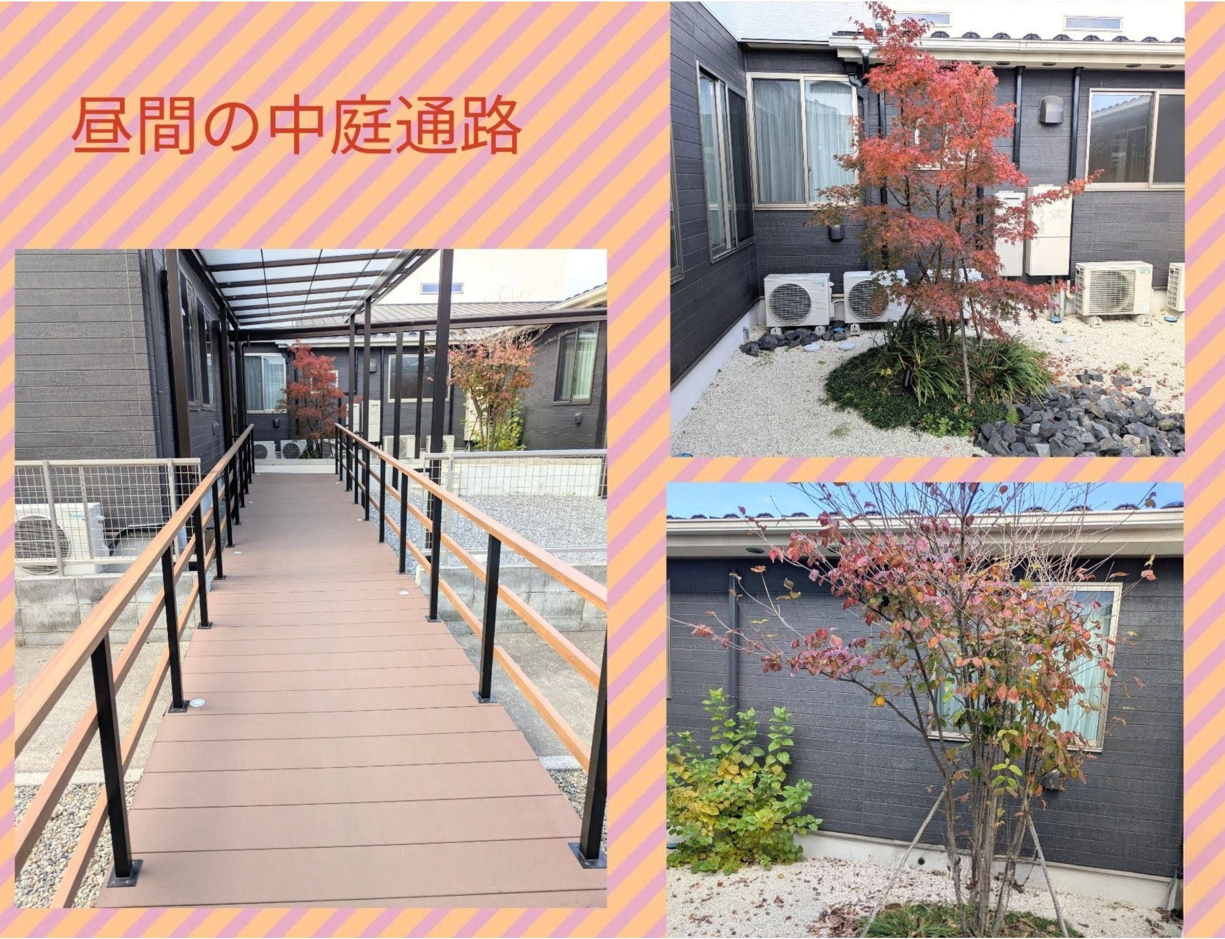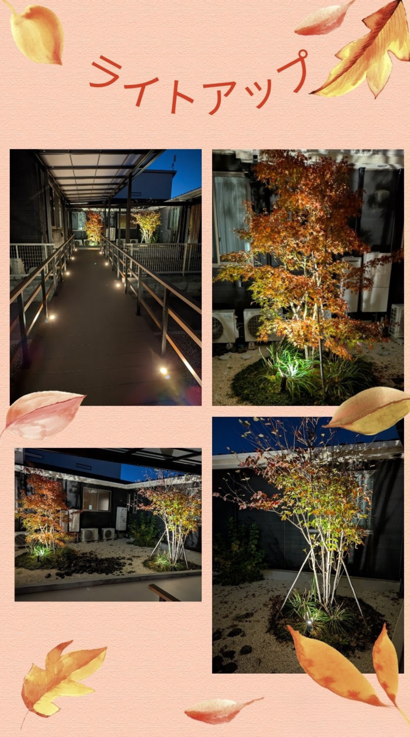 昼間は明るく落ち着いた雰囲気の通路ですが、夜になるとライトが柔らかく灯り、まるでイルミネーションのように幻想的な空間へと変わります。ご利用者様やご家族の方からも「きれい」「光の中で歩いてみたい」と大変ご好評をいただいております。